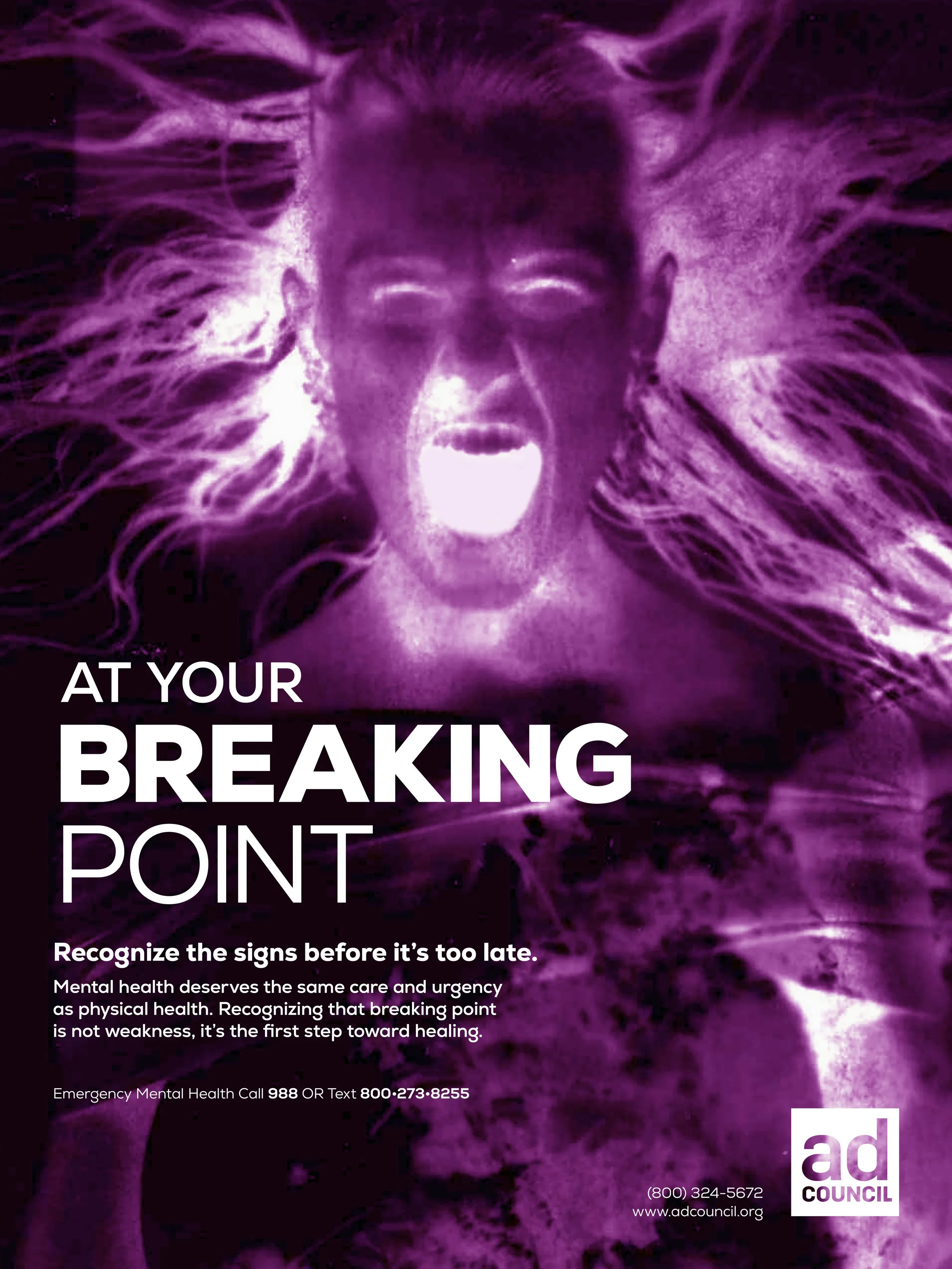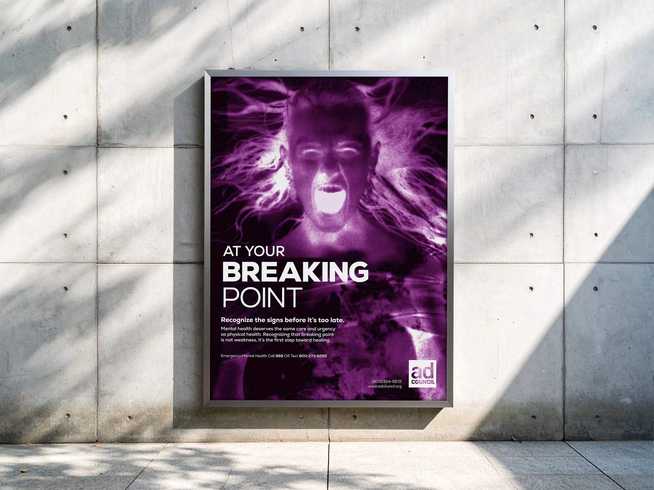 This PSA poster is about mental health awareness. It uses powerful, dreamlike images to convey what it feels like to reach a breaking point. The twisted, high-contrast picture of a screaming figure and the purple color scheme create a powerful, unsettling mood. Layered textures and strange effects add to the feeling of chaos and inner struggle, helping to show what mental distress can feel like inside.