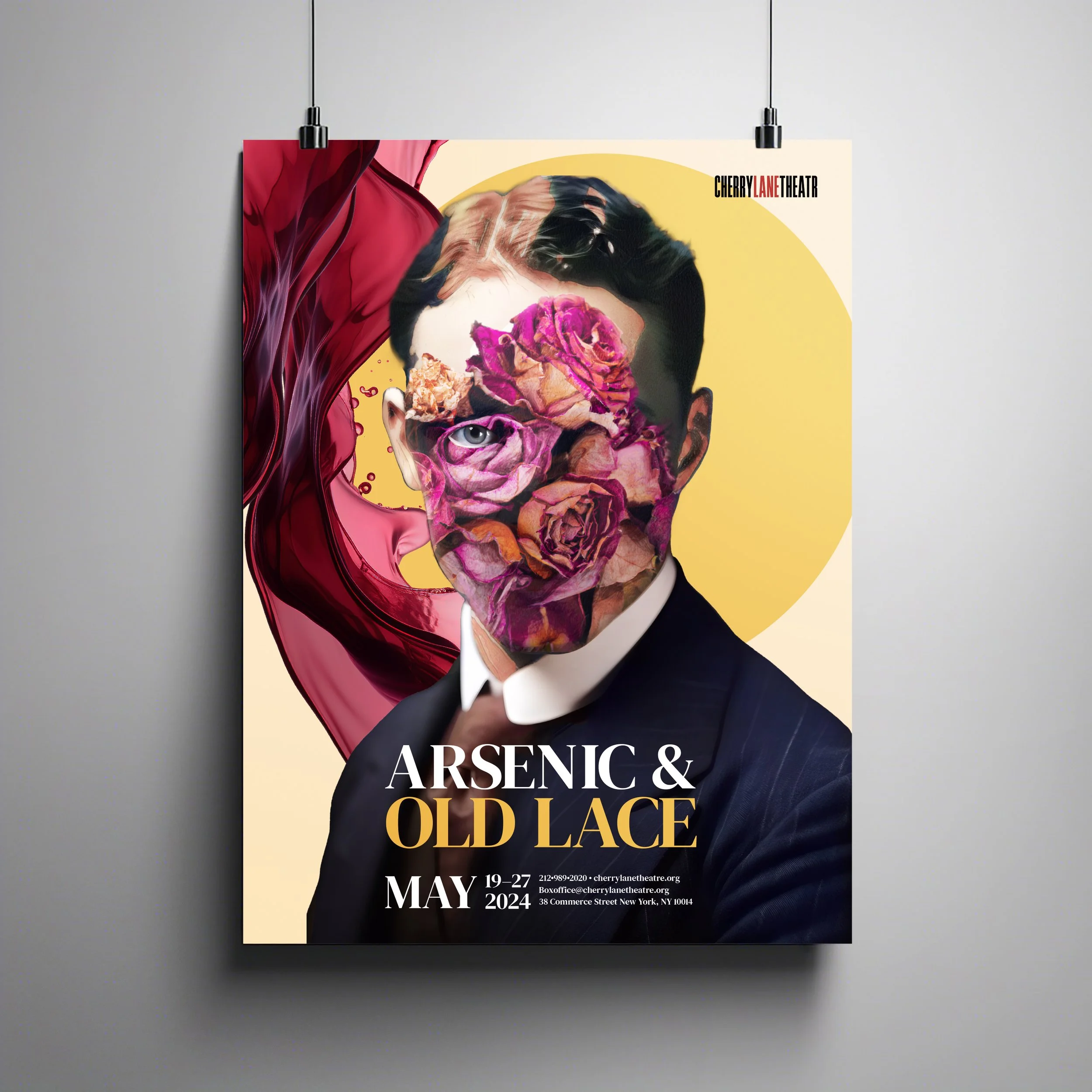 This poster for Arsenic & Old Lace uses surreal collage and bold color to create a striking, dramatic visual. The floral distortion of the portrait adds a sense of mystery, reflecting the play’s dark humor.