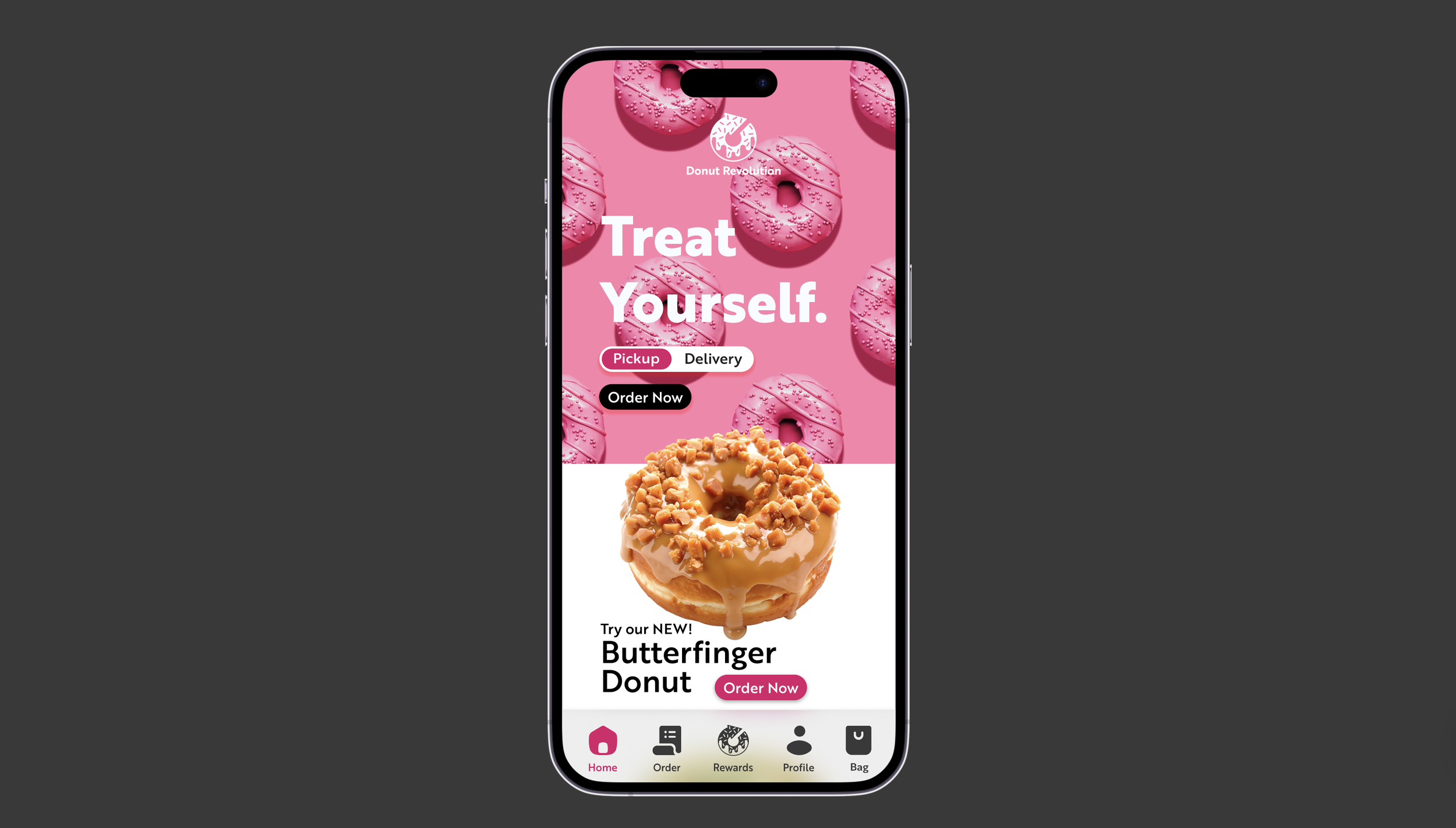 This project features a mobile app design for the donut brand Doughnut Revolution, aiming to create a fun, enjoyable experience for users. The app uses a bright pink color scheme, playful images, and easy-to-read text to showcase the brand’s lively, rich style. Clear action buttons and simple menus help users easily navigate, order, and view their rewards in the app.