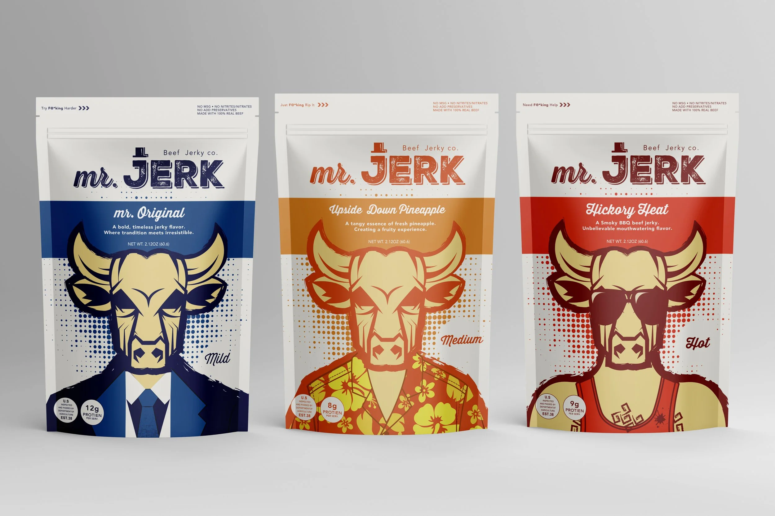 Mr. JERK Co. is a beef jerky brand that gives traditional snack packaging a bold, character-driven twist. Every flavor has its own stylized bull character that matches its taste, like the clean-cut Bull for original flavor, the relaxed tropical Bull, and the confident Bull, which represents hickory heat flavor. The packaging uses modern illustrations with a gritty texture to bring out the rugged side of jerky, while adding personality and humor. The bull icon is always front and center, and each flavor pops with its own colors and unique outfit details.