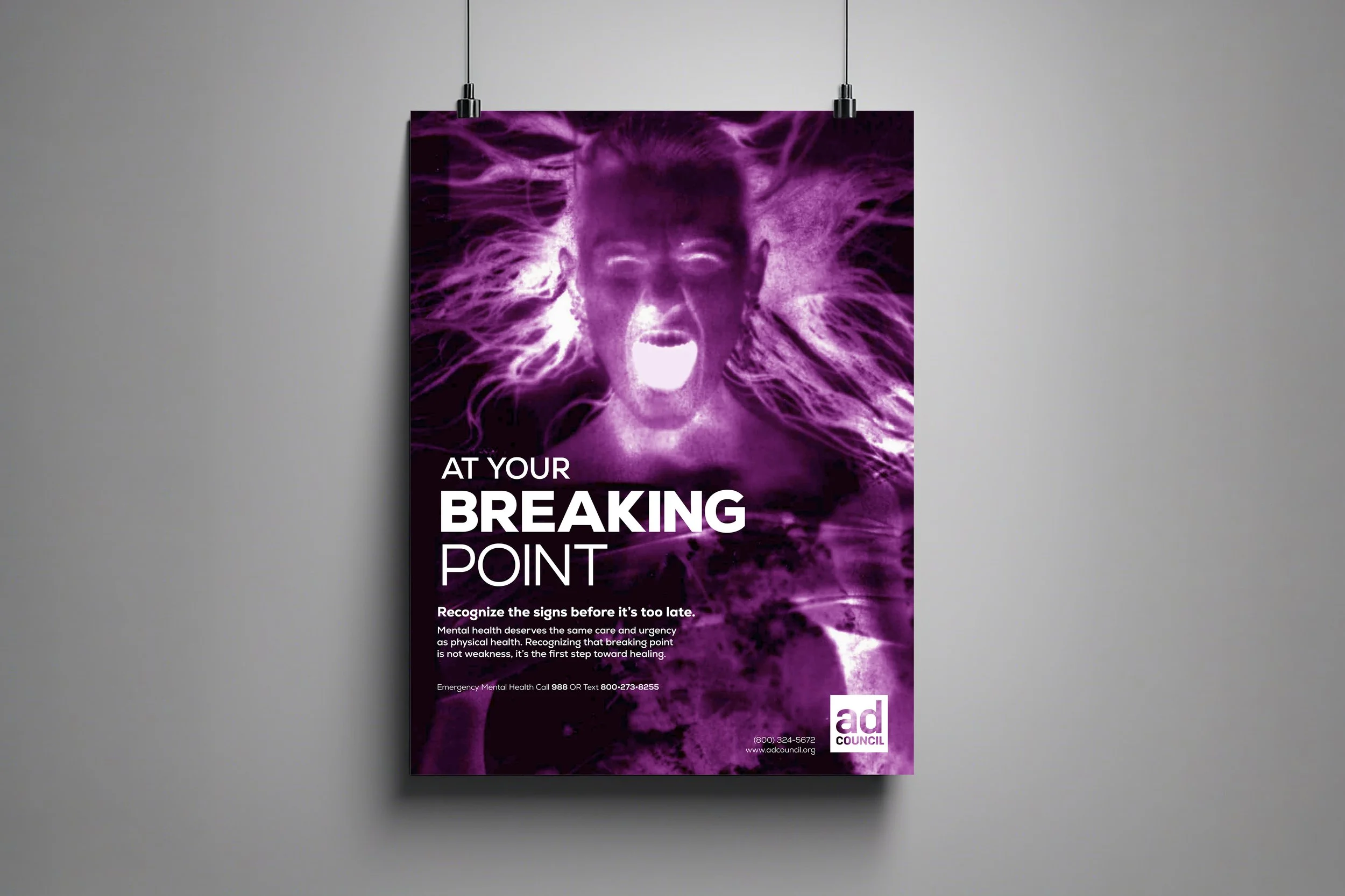 This PSA poster is about mental health awareness. It uses powerful, dreamlike images to convey what it feels like to reach a breaking point. The twisted, high-contrast picture of a screaming figure and the purple color scheme create a powerful, unsettling mood. Layered textures and strange effects add to the feeling of chaos and inner struggle, helping to show what mental distress can feel like inside.