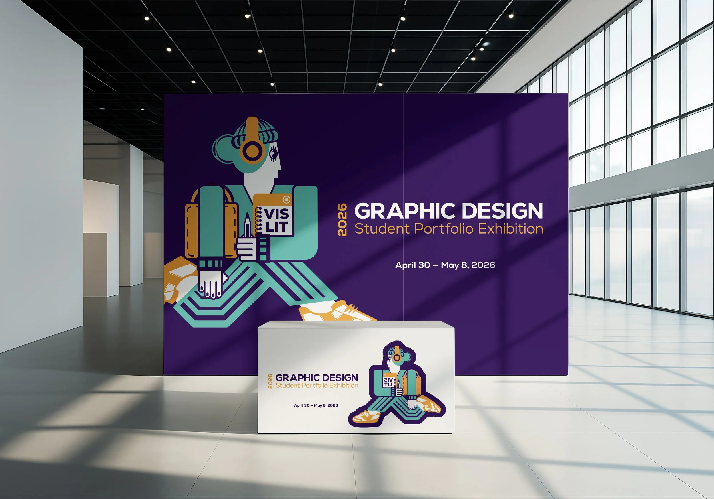 This poster for the 2026 Graphic Design Student Exhibition uses bold visuals and clean typography to showcase creativity and innovation. The design highlights student work through a modern, eye-catching composition that draws viewers in.