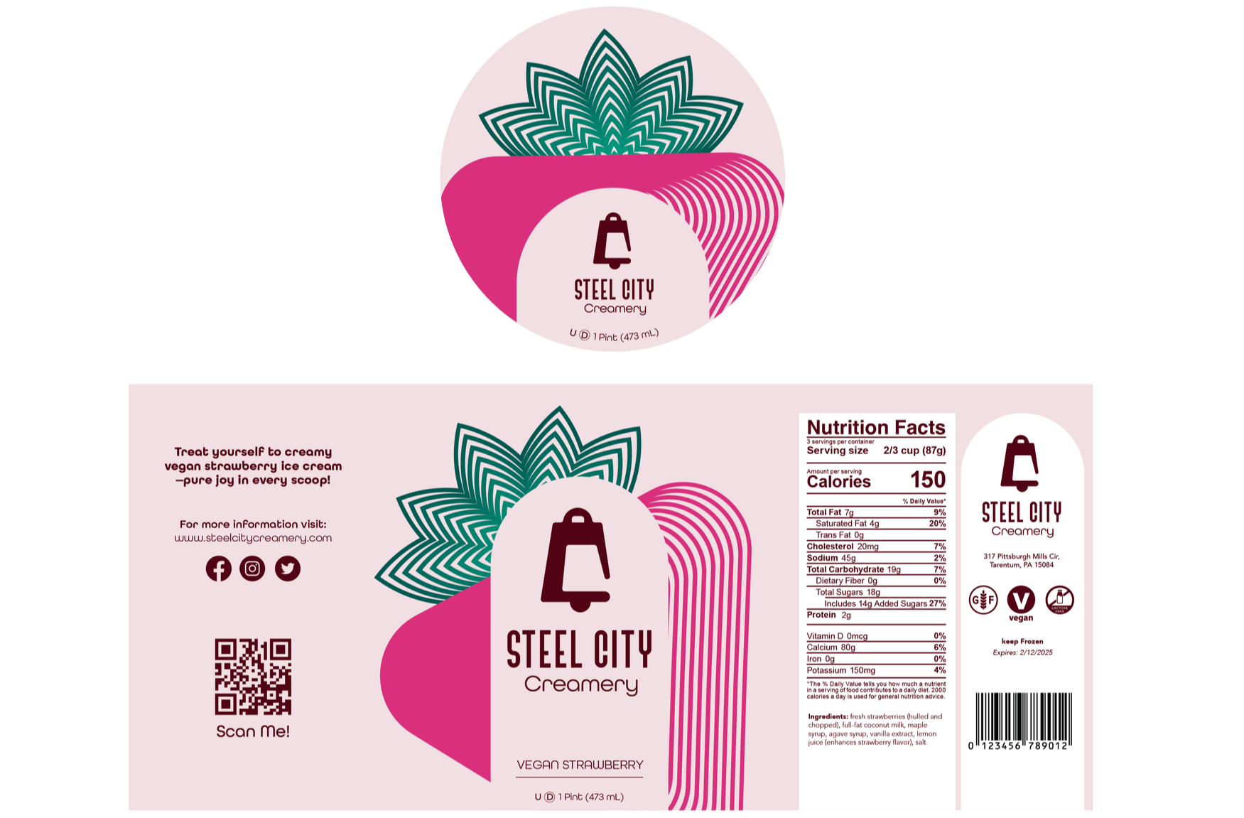 Steel City Creamery is an ice cream company that showcases modern, eye-catching ice cream packaging. The ice cream label has geometric patterns, creating a fresh and vibrant visual identity. The layered linework adds depth and movement, while the minimal logo and typography keep the branding sleek and contemporary. Steel City Creamery packaging feels both playful and premium, effectively appealing to a younger, trend-conscious audience while clearly communicating the product as a vegan strawberry flavor.
